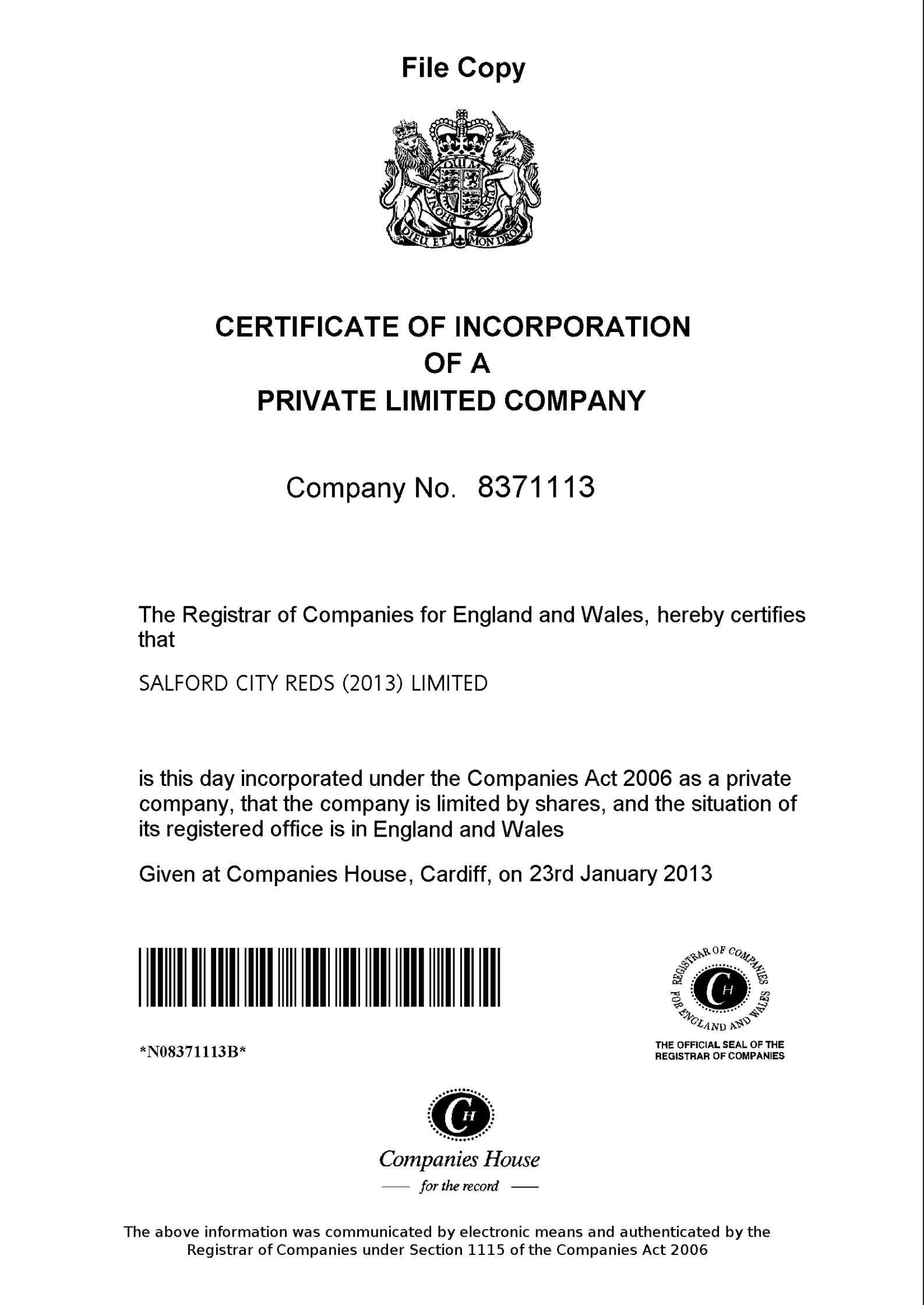 A duplicate of the certificate of incorporation of Salford City Reds (2013)