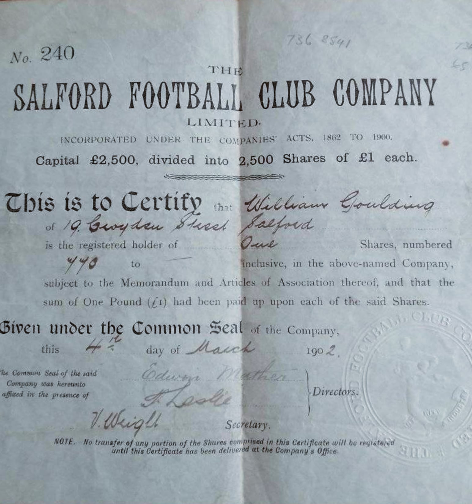A share certificate for the Salford Football Club Company Limited.(Copyright © Dorothy Higson.)