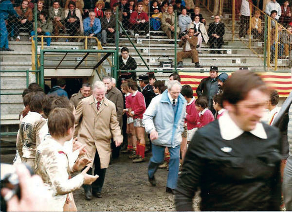 At the age of 10, Pete Bowden fulfilled his boyhood dream of leading Salford out as their mascot for this very game. Pete’s recollection of the match was published in The Scarlet Turkey in 2009. What follows below are Pete’s own words and photos of the trip. Given that both Risman and Jenkins were into their seventies by this time, they were not averse to taking part in some of the high jinx.